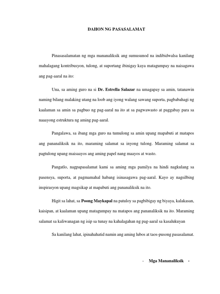 Human translations with examples. English French German Latin Spanish View all. DAHON NG PASASALAMAT Walang hanggan ang aming pasasalamat sa mga taong tumulong sa amin upang mapagtagumpayan at maging epektibo ang aming ginawang pananaliksik.