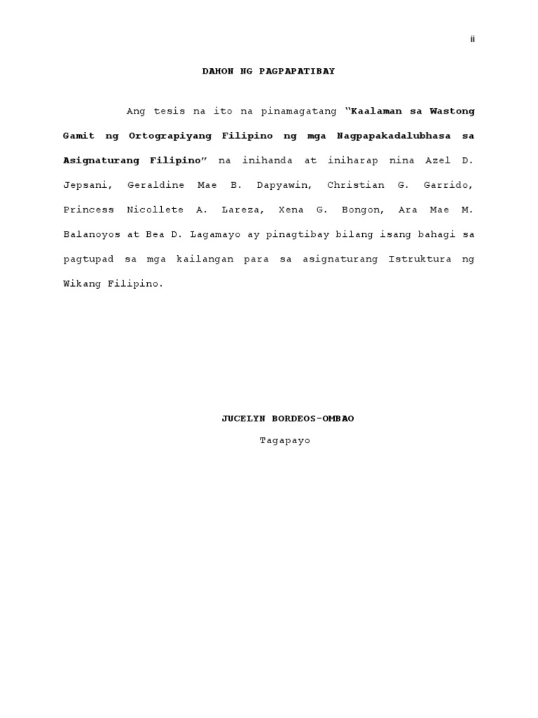 Pagpapatibay In Ng English Thesis Dahon. Dahon ng pagpapatibay Ang pag-aaral na ito na may pamagat na PANANAW NG MGA PILING MAG-AARAL KURIKULUM NG PROGRAMANG PANGKOLEHIYO NA MAY MALAKING KINALAMAN SA PAGPAPANATILI AT PAGPAPAUNLAD NG WIKANG FILIPINO ay iniharap at inihanda ng mga mag-aaral ng Taon at Pangkat Halimbawa IV-Einstein bilang bahagi ng pagtupad sa. Ang mga Customary Law ng mga Katuiitubo ng Adams Ilocos Norte.